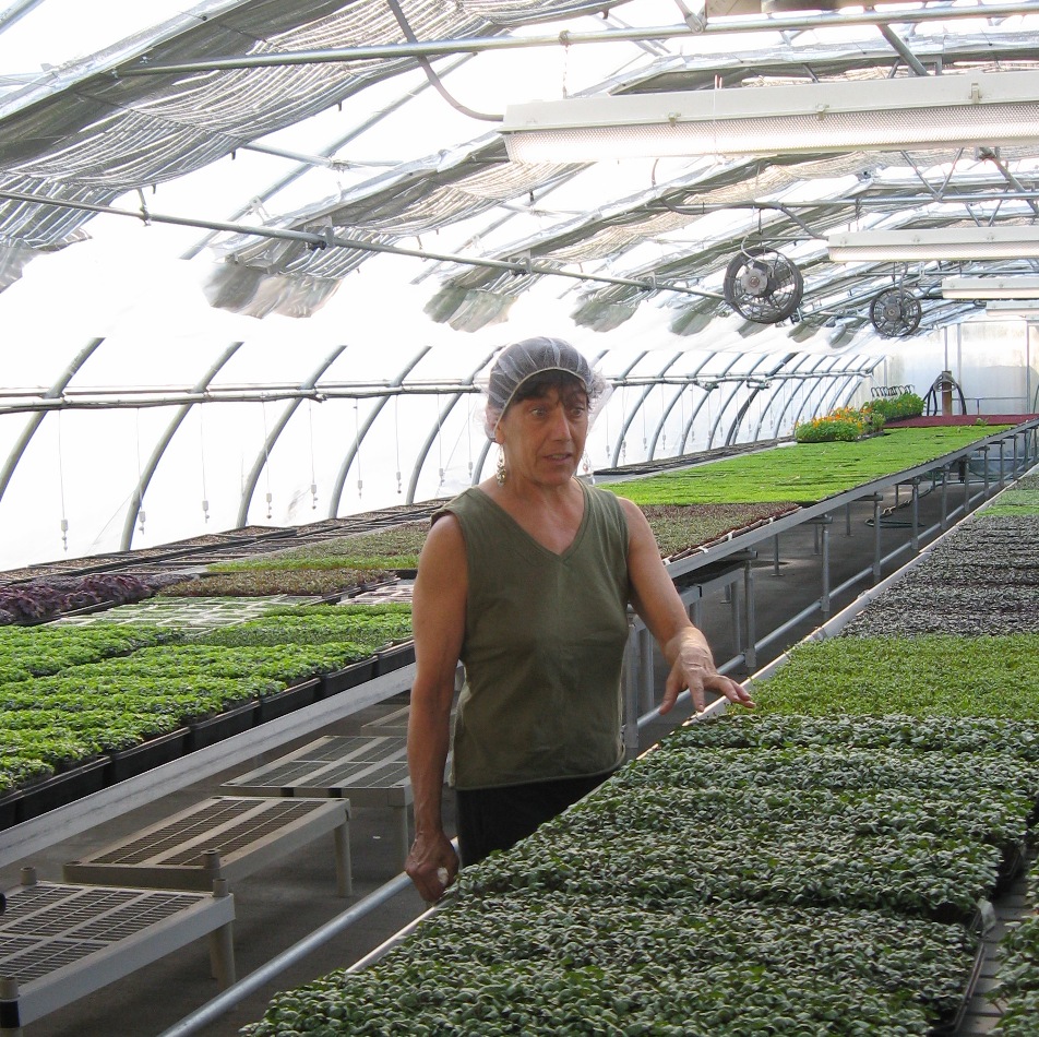 Owner Lauri Roberts in the greenhouse with microgreens at Farming Turtles in Exeter, RI.